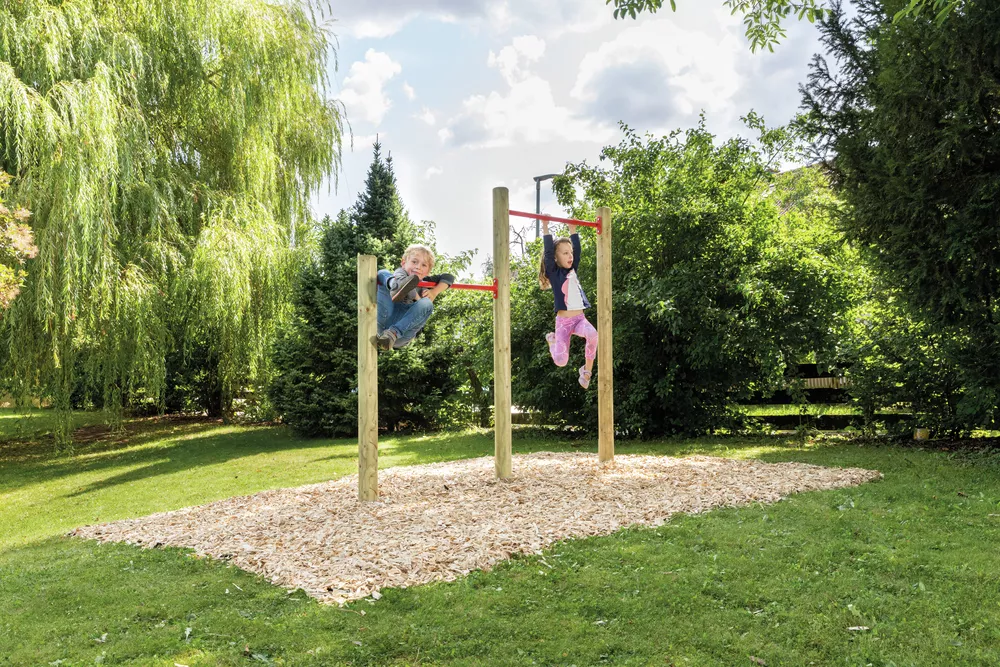 Das Stufenreck Eddi 210 cm lang bietet mit zwei roten, pulverbeschichteten Reckstangen je 90 cm jede Menge Spaß für kleine Turner von 3 bis 12 Jahren. Die stabilen, kesseldruckimprägnierten Holzpfosten sorgen für sicheren Halt.