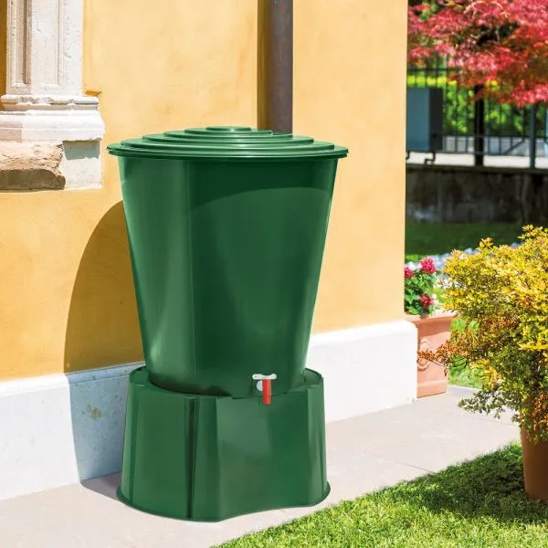 Die runde Garantia Regentonne fasst 310 Liter und besteht aus robustem, UV-beständigem Kunststoff. Sie verfügt über einen Deckel mit Windsicherung und einen Auslaufhahn zur einfachen Wasserentnahme. Garantia steht für langlebige Qualitätsprodukte Made in Germany und verbindet Funktionalität mit ausgezeichnetem Design.