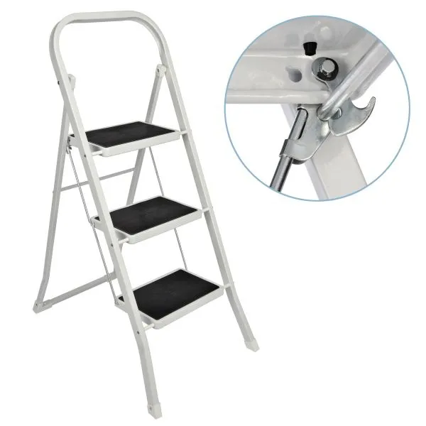 Der Stahlrohr-Klapptritt mit 3 Stufen von Haushalt International bietet dank Sicherheitsbügel, rutschfesten Auflagen und Klappsicherung einen sicheren Stand und ist platzsparend verstaubar.