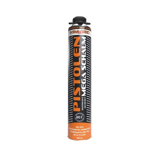 Der KIM-TEC PUR-Pistolenschaum MEGA ist ein leistungsstarker Polyurethanschaum, der bei Temperaturen von -10 °C bis +35 °C verarbeitet werden kann. Der halbhart-elastische Schaum bietet eine Schaumausbeute von 65 bis 75 Litern, abhängig von Material- und Umgebungstemperatur.