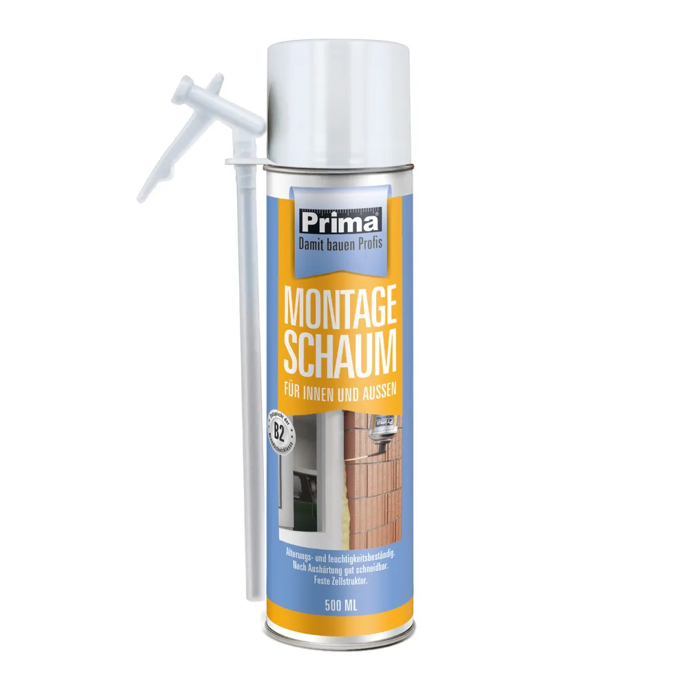 Der Prima Montageschaum 500 ml ist ein gebrauchsfertiger, einkomponentiger Polyurethanschaum mit guten Dämm- und Isoliereigenschaften.