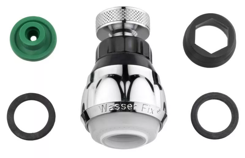 Mengenregulierung reduziert die Durchflussmenge um bis zu 50 % auf ca. 7 l/min., mit Kugelgelenk aus Messing, mit Gewinde-Übergangsstück aus Kunststoff, M24 x 1 AG auf M22 x 1 AG, nicht geeignet für drucklose Geräte