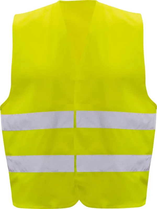Leuchtgelbe Warnschutzweste aus 100?% Polyester mit umlaufenden Reflektorstreifen und Klettverschluss zur Weitenregulierung. Entspricht der Norm DIN EN ISO 20471:2013 Klasse 2 und eignet sich für den universellen Einsatz im Bereich Warnschutz.