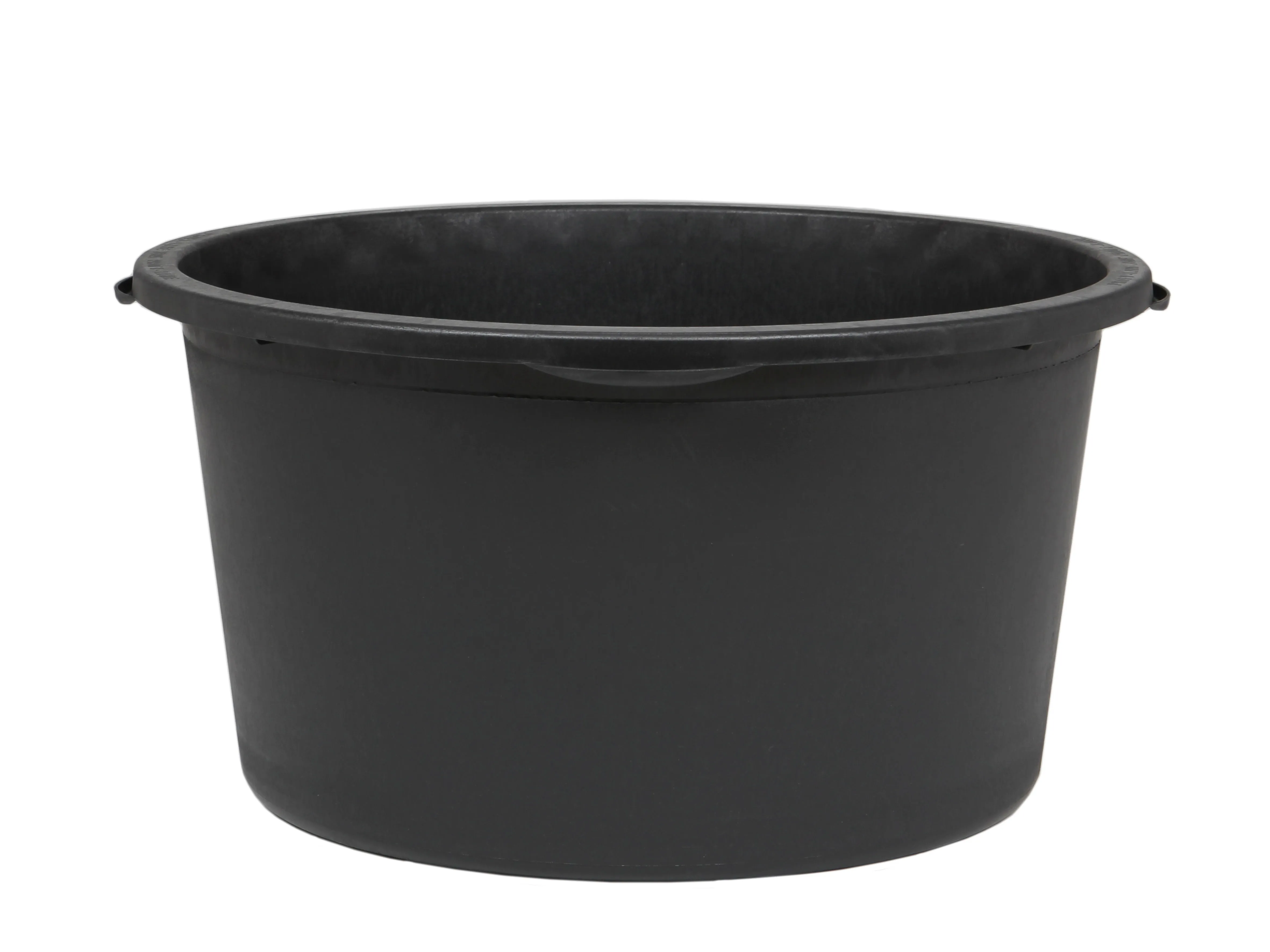 Schwarz, aus recyceltem Polyethylen-Mix, ideal für das Bauhandwerk. Mit Liter-Skala, verstärktem Rand und ergonomischen Griffmulden.