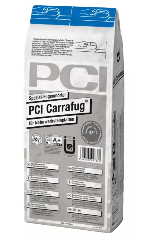 Der PCI Carrafug jurabeige 5 kg ist ein flexibler Spezial-Fugenmörtel für Naturwerksteinplatten.