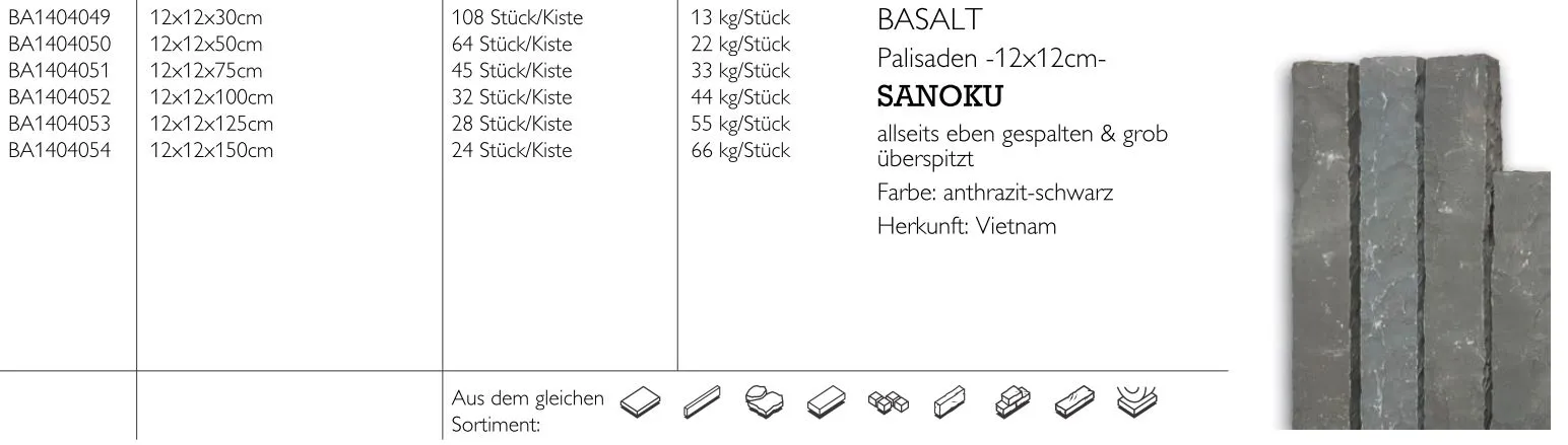 Basalt-Palisade Sanoku12x12x50 cm, anthrazit-schwarz allseits eben gespalten &grob überspitztArtikelnummer: 1988391L: 500 mm, B: 120 mm, S: 120 mm