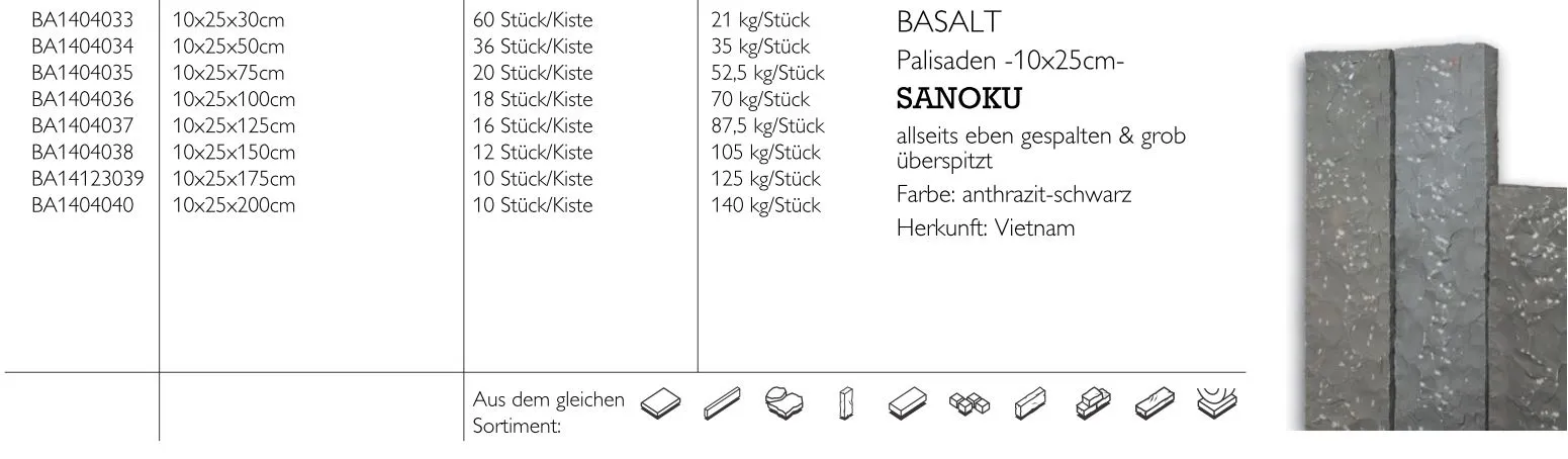 Basalt-Palisade Sanoku8x20x75 cm, anthrazit-schwarz allseits eben gespalten &grob überspitztArtikelnummer: 2334140L: 750 mm, B: 200 mm, S: 80 mmArtikel wurde in den Warenkorb gelegtZum Warenkorb