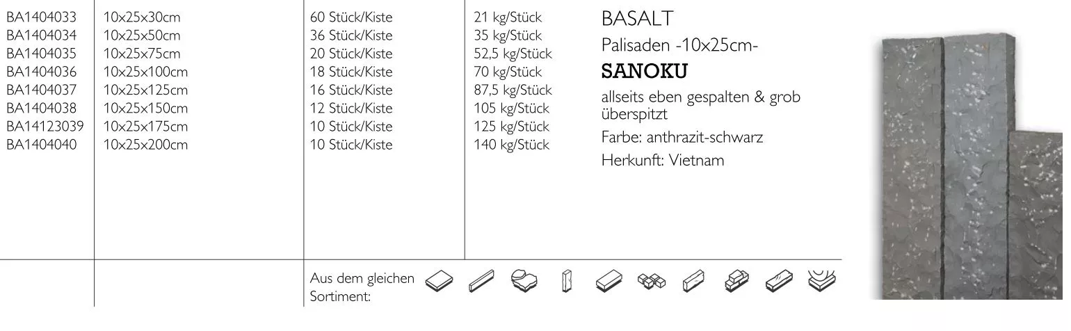 Basalt-Palisade Sanoku10x25x30 cm, anthrazit-schwarz allseits eben gespalten &grob überspitztArtikelnummer: 2232619L: 300 mm, B: 250 mm, S: 100 mmArtikel wurde in den Warenkorb gelegtZum Warenkorb