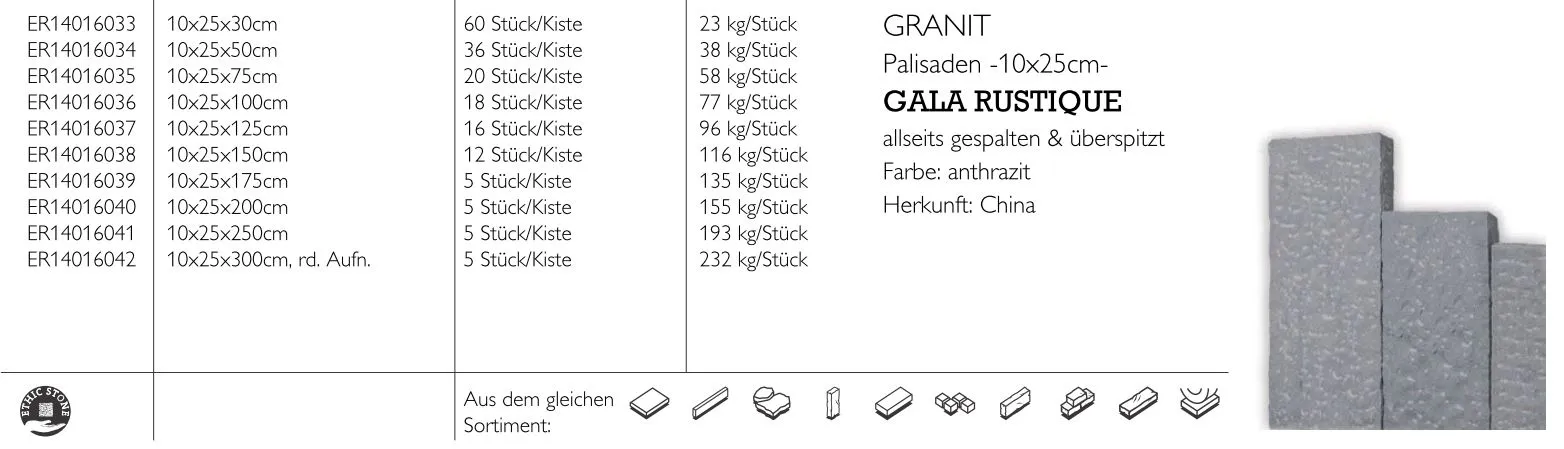 Granit-Palisade Gala Rustique10x25x100 cm, anthrazit allseits gespalten & überspitztArtikelnummer: 2334382L: 1000 mm, B: 250 mm, S: 100 mmArtikel wurde in den Warenkorb gelegtZum Warenkorb