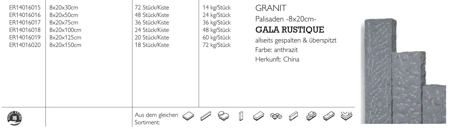 Granit-Palisade Bravo Rustique8x20x100 cm, edelgrau allseits gespalten & überspitztArtikelnummer: 1990535L: 1000 mm, B: 200 mm, S: 80 mmArtikel wurde in den Warenkorb gelegtZum Warenkorb