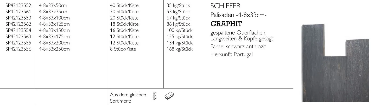 Stelen Schiefer Graphit 4-8x33x175cm, gespalten 4 Seiten gesägt, schwarz-anthrazit