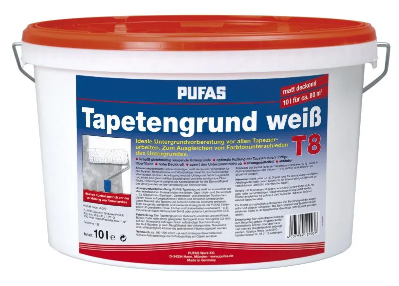 Der Pufas Tapetengrund TW8 10 l weiß ist ein ist ein gebrauchsfertiger, weiß deckender Voranstrich für alle Tapeten, Renoviervliese und Wandbeläge.