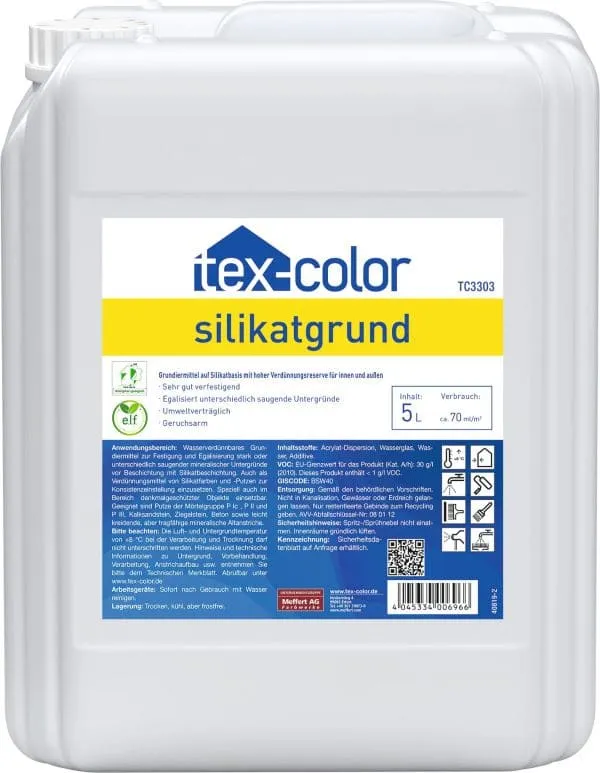Der Silikatgrund 10 l von Tex-Color ist ein wasserverdünnbares Grundiermittel zur Festigung und Egalisierung stark oder unterschiedlich saugender mineralischer Untergründe vor der Beschichtung mit Silikatbeschichtungen.