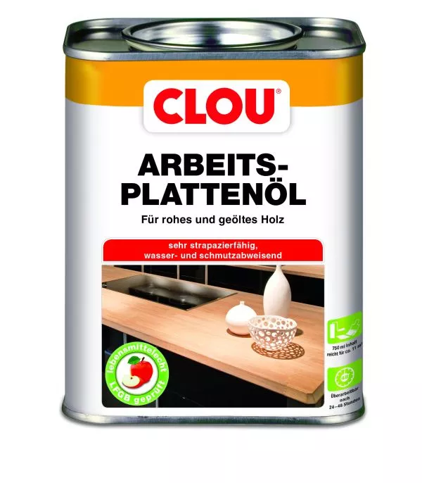 Das Clou Arbeitsplattenöl ist eine spezielle Öl-Wachs-Kombination, welche die Maserung betont und die Holzoberfläche atmen lässt. Es bietet farblosen Schutz vor Wasser und Schmutz und ist ideal für rohe oder geölte Massivholzoberflächen.